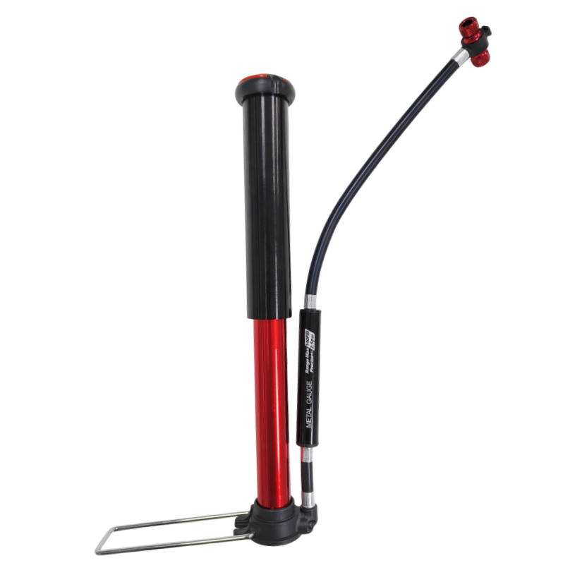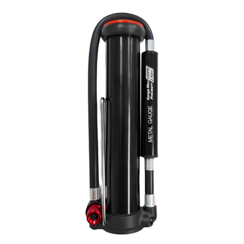 Bicycle portable pumpWith pressure gaugeMaterial: Aluminum alloyColor: BlackAir pressure: 220PSIApplicable: Schrader /Presta ValveSize: 58*37*180mmWeight: 170g